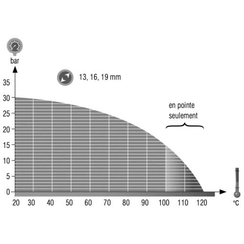 - Pression d’éclatement à 20 °C : DN 15 (1/2 ») à DN 20 (3/4 ») 90 bars, DN 25 (1 ») 78 bars